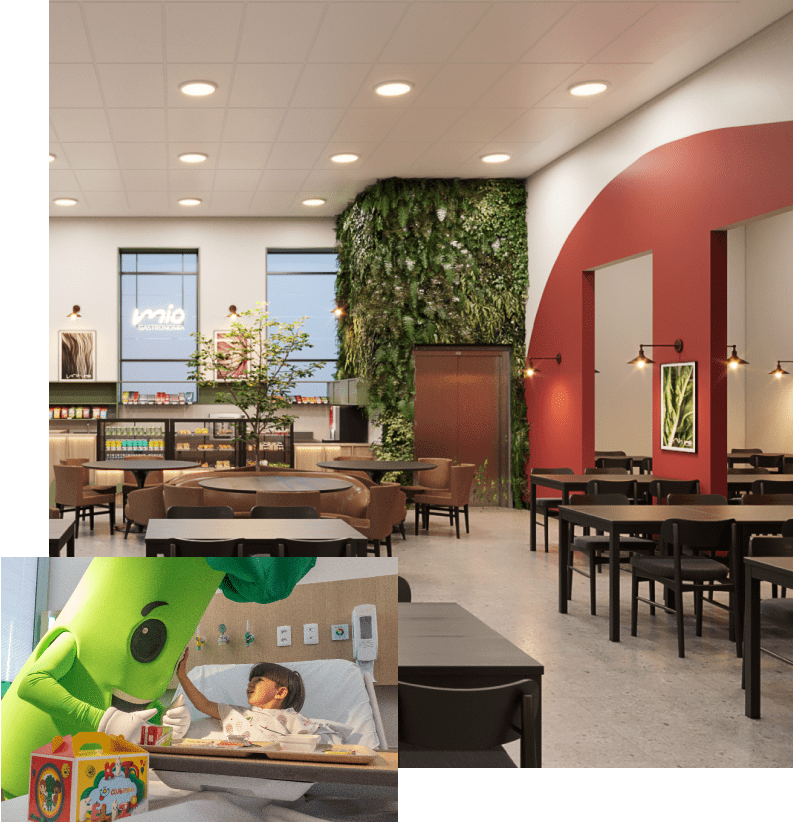 Quando o assunto é alimentação infantil, lúdico é a palavra-chave. Por isso, para esse público, as refeições são apresentadas de forma divertida, com um cardápio diferenciado. A interatividade está também presente, por meio de jogos de colorir e dinâmicas com a equipe de nutrição clínica.